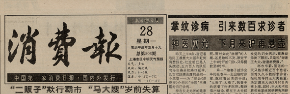 · 1994年2月25日《消费报》刊登“掌纹神医义务就诊”