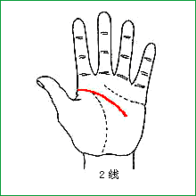2线,也称近端横曲线、小鱼际抛物线、智慧线、心线。因与大脑及神经系统功能密切相关,所以又称为“脑线”,它所提示的疾病,偏重于神经、精神方面及心血管系统,智力高低、外伤都可以从2线上反映出来。