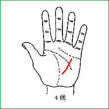 4线,也称健康线。 起于大鱼际(以不接触3线为原则)斜行向小指方向,一直可到小指根部1线上。4线大多见于劳心者或身体弱的人,在身体情况较差的时候,4线会一直加深,待到健康恢复后逐渐变浅。 肝、肾功能较差或慢性呼吸系统疾病的患者,常出现深而明显的4线。 4线没接触或没切入3线时,表示与大病无关。乳腺癌、肺癌、胃癌、肝癌患者多见4线在3线尾部斜行切入,其线的深浅和3线相等。 摘自:《现代掌纹诊病》